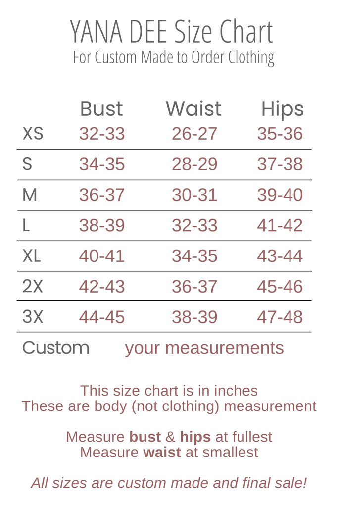 These shorts will be made to order in Traverse City, Michigan USA from sustainably sourced materials. Yana and her team carefully construct every item in our fair wage, low-waste production studio.
