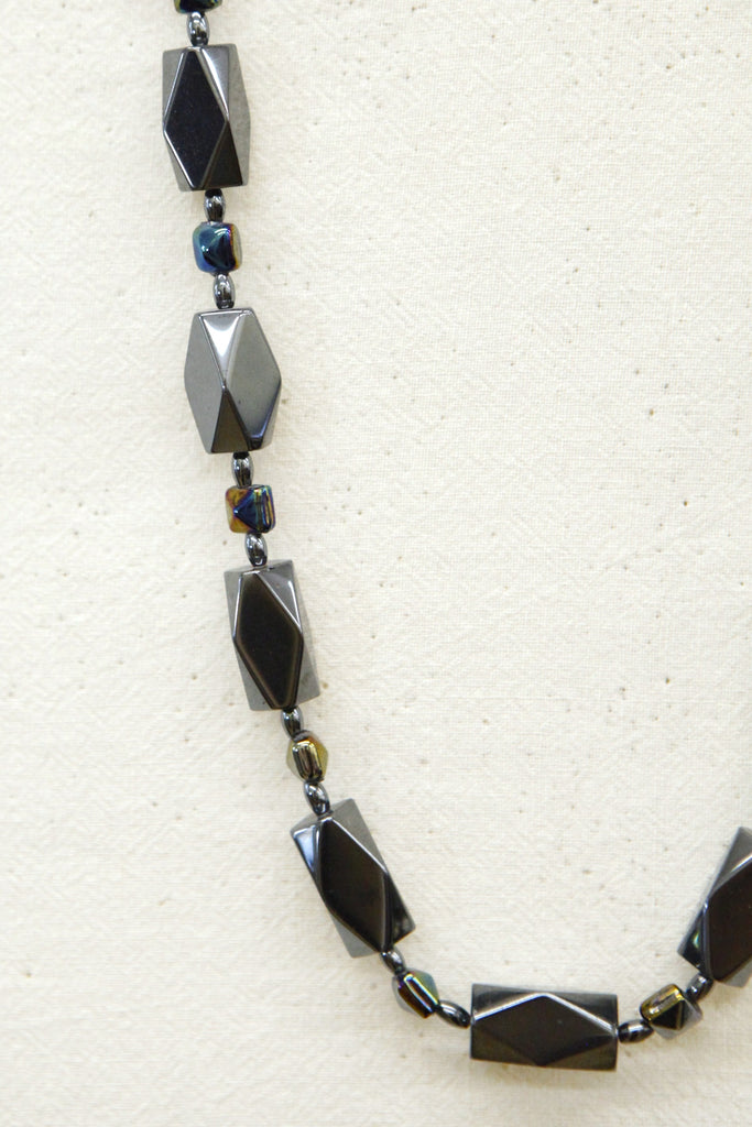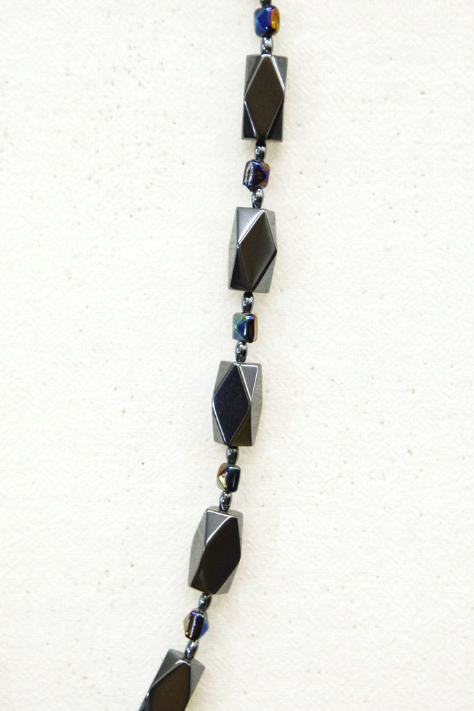 This necklace is dark steel color, with spacer stones that have subtle highlights of purple, green, gold, and more.