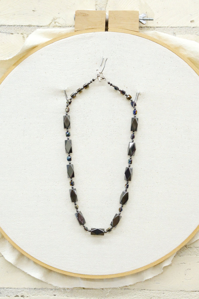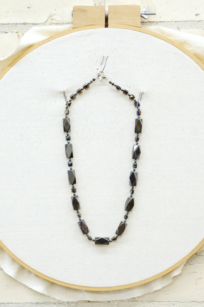 This necklace is made from hematite stone beads with glass spacer beads on a metal wire with a metal toggle clasp.