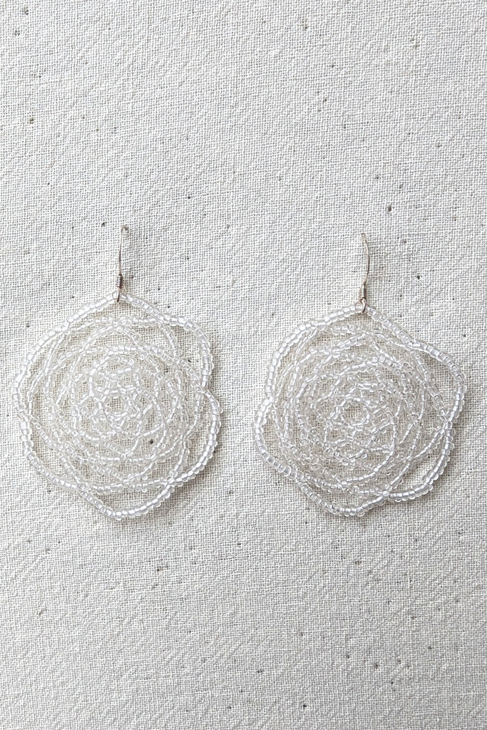These earrings are made from glass seed beads, thread, and hypo-allergenic earring hooks.