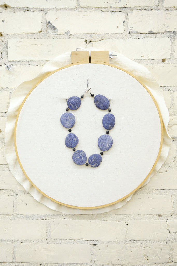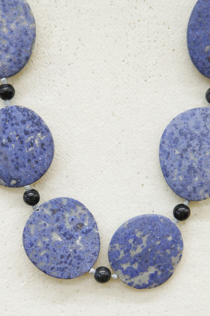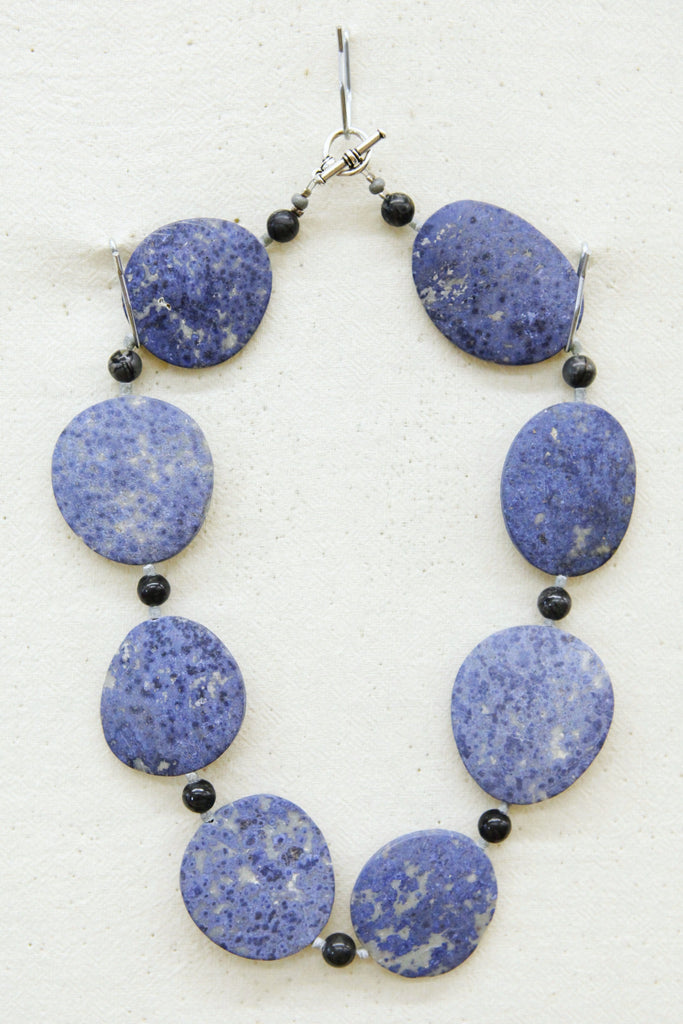 This necklace large unique Dusty Blue natural stones, spaced by smaller Light Gray and Near Black beads.