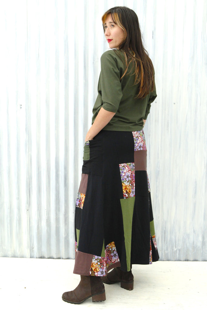 This skirt is made from patches of solid Green, Brown, and Black, as well as Summer of Love Print (An abstract floral print made of the colors Red, Brown, Purple, Black, Periwinkle, Gold, and Natural)