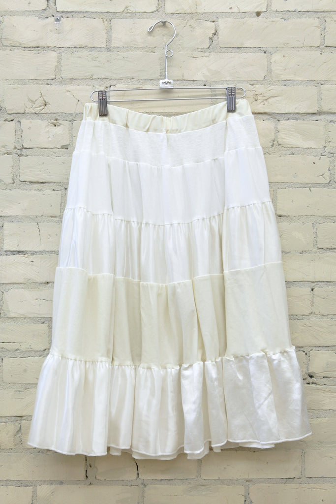 It isn't hard to tell that this pretty skirt is quite special. This full, tea length peasant tiered skirt features sections of flowy knit and shiny silk, for an overall affect that is eye-catching and quite flattering. This skirt would be cute as a layer under slightly shorter skirts and dresses in the winter, and worn with a simple white or cream top for sophisticated summer style.