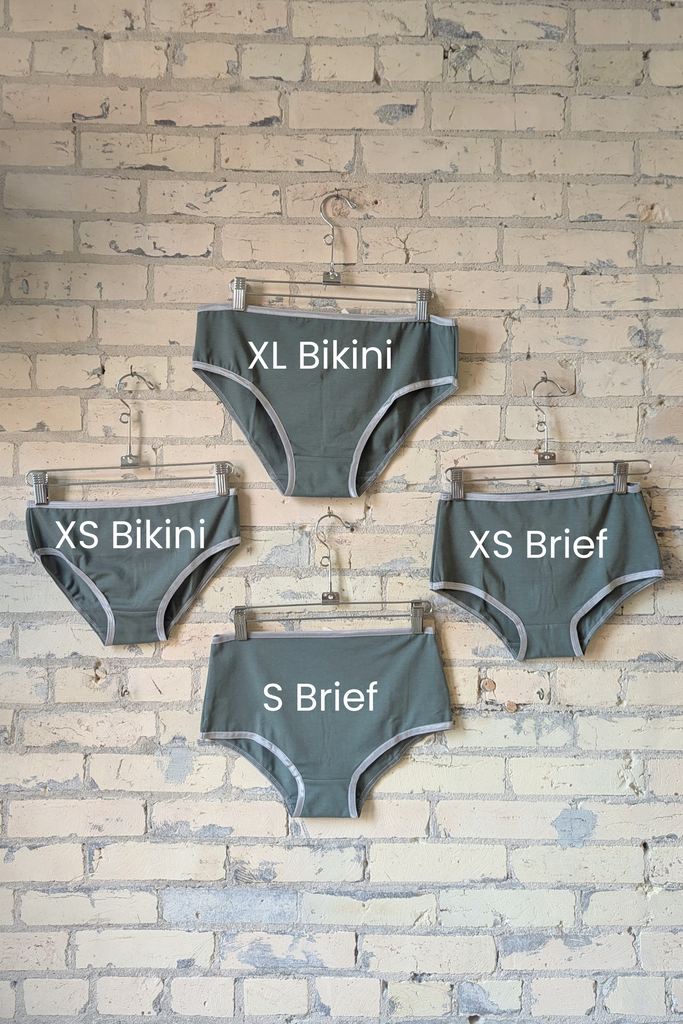 We are sew sad to say, this color is discontinued! Since we can't make more and there are only a few sizes left, we're putting the last ones on clearance. (Please note, this is our older, thicker, darker Sage Underwear... not to be confused with our new 95% Organic Bamboo Siro Soft Sage Underwear.)