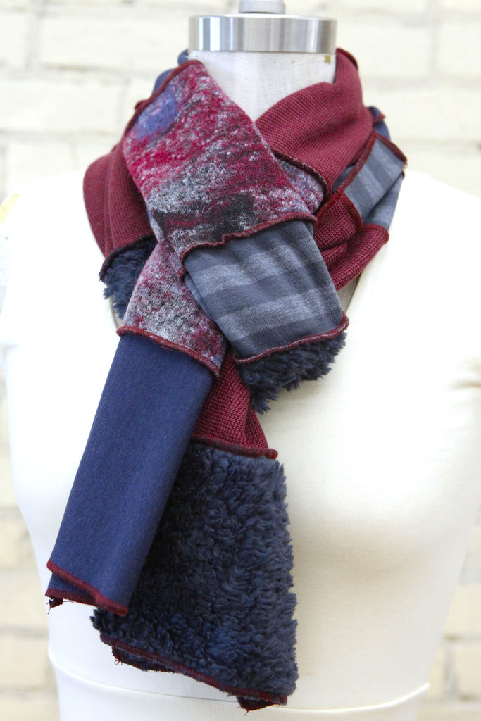 The pallet of this scarf is built around Maroon & Navy, with hints of Gray. The colors remind us of warmer days of ripe blueberries and plums.