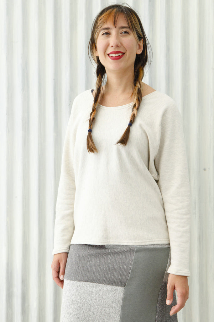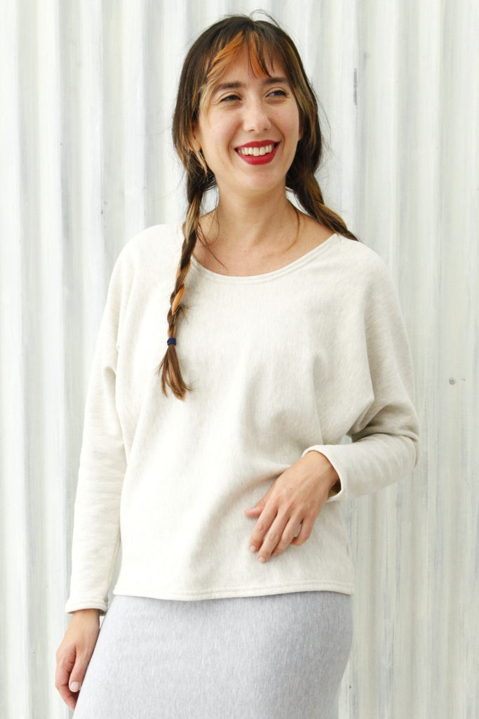 This all natural top is made from 100% Organic Cotton French Terry. This classic sweatshirt fabric is smoother on the outside, with terry loop texture on the inside. It is soft, thick, and and cozy.