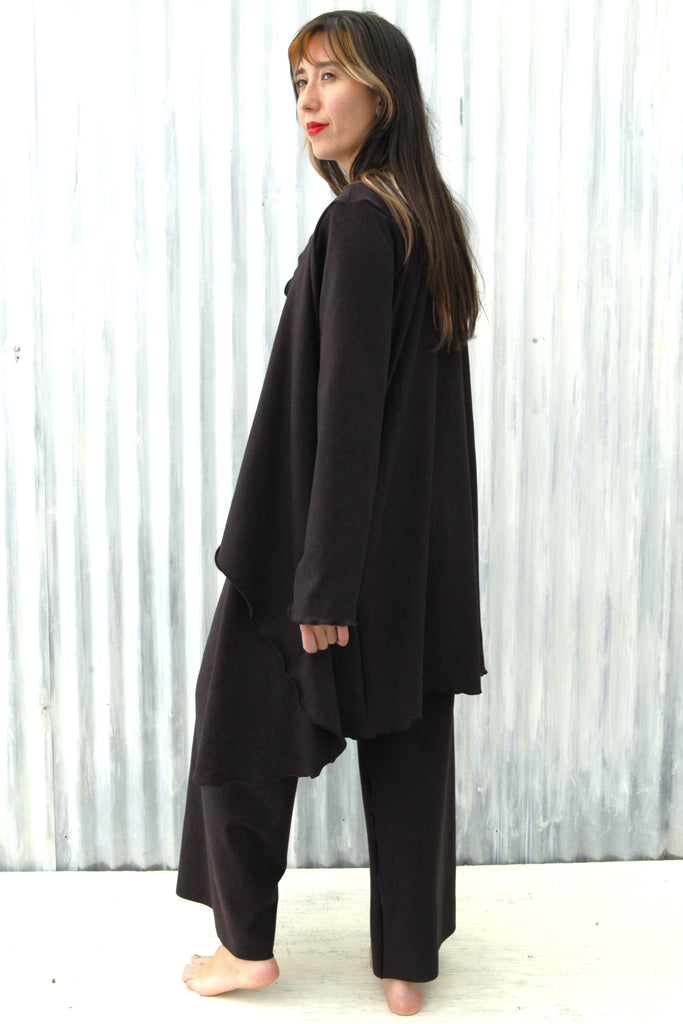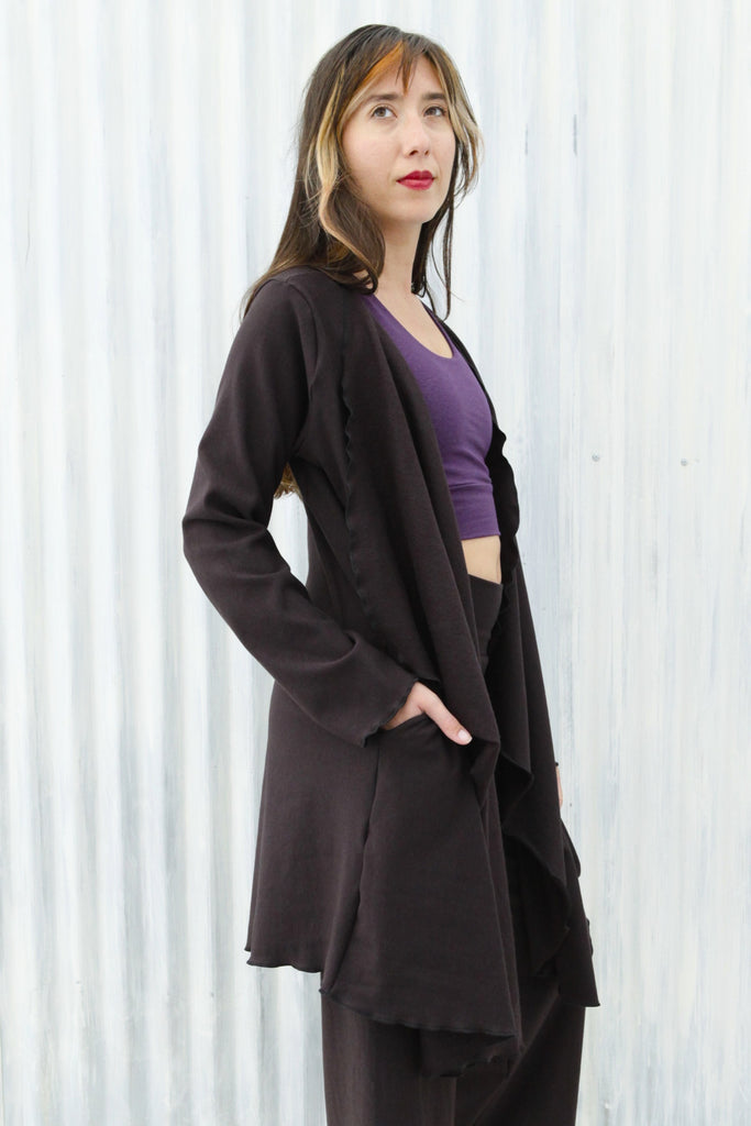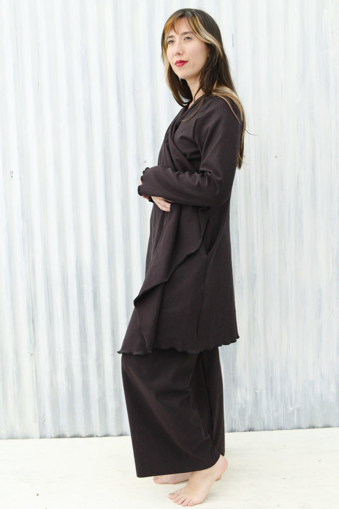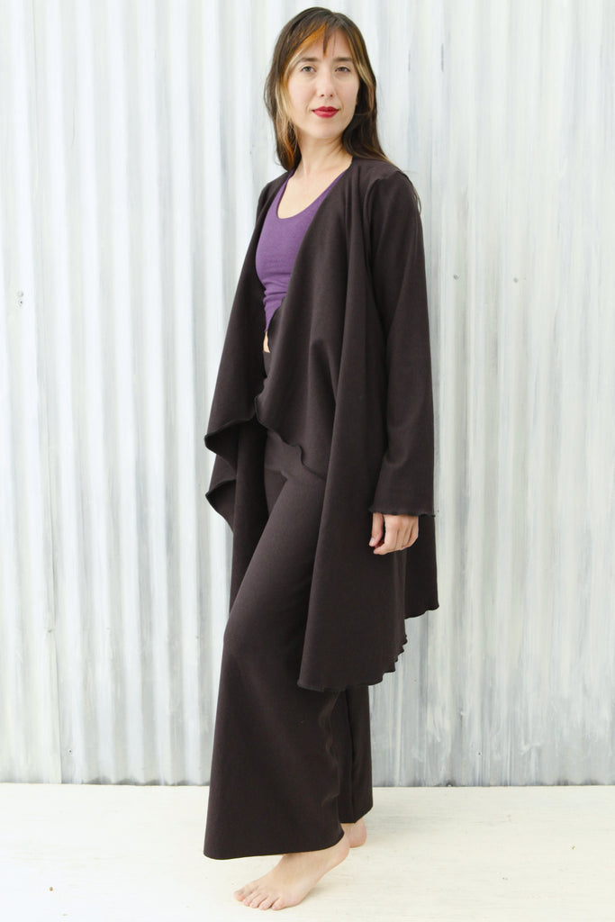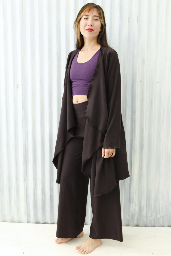 It's about time we made an outer layer out of our beloved stretch fleece fabric! We couldn't think of a better way to add a cozy layer to our offerings, than to resurrect our retired Ramona Wrap. This soft, generous, warm duster will help you thrive in comfort this winter. The updated design now features pockets and rounded corners, for extra functionality. This elegant outer layer is sophisticated and stylish enough for special occasions, and cozy enough to wear every day.
