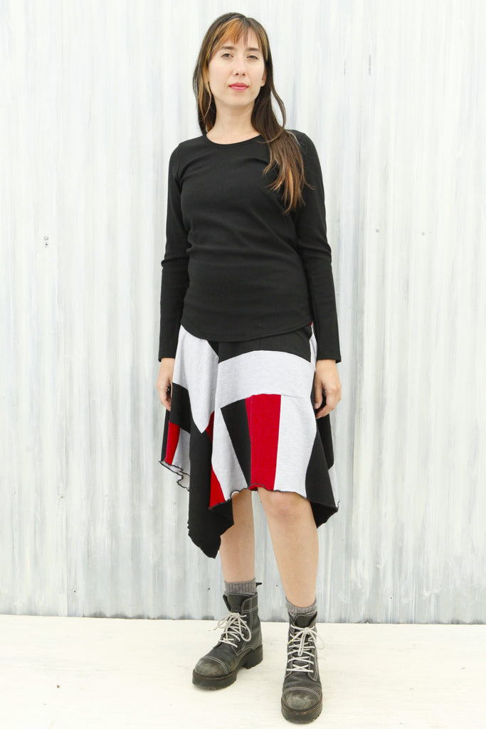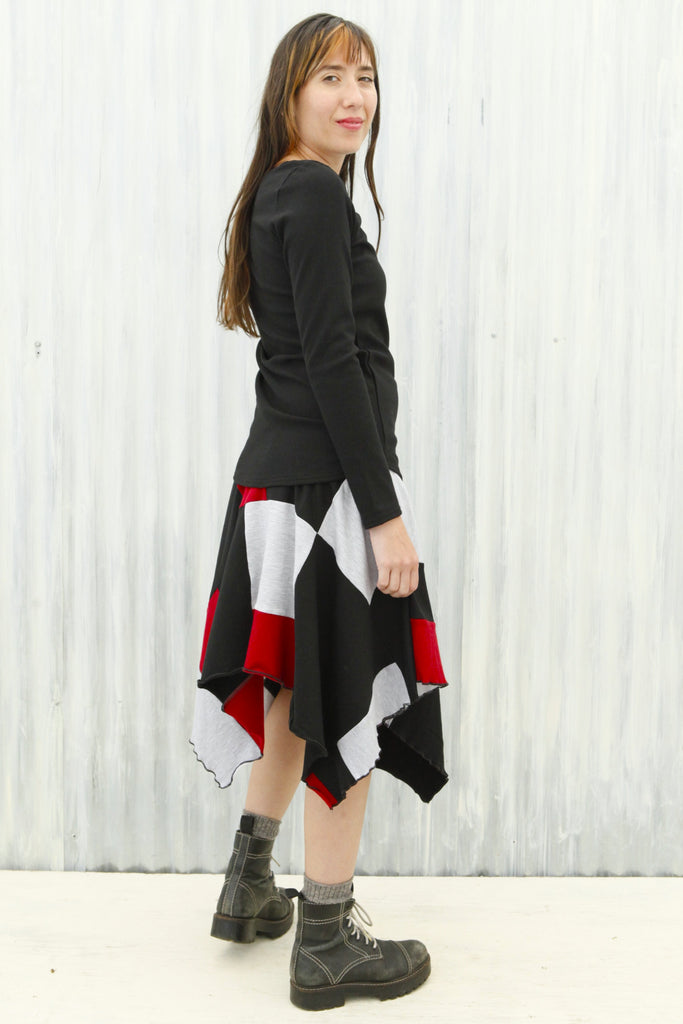 This skirt is a patchwork of Black, Red, and Light Gray. The band is solid Black.